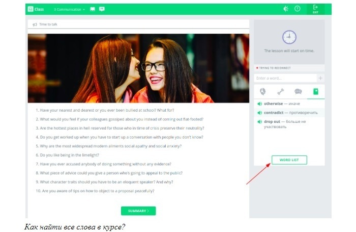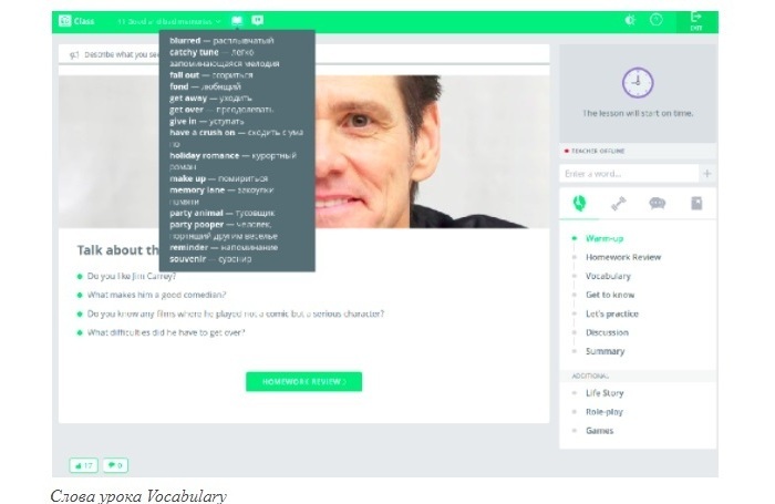 Во время урока и студент и преподаватель может добавить незнакомое слово или словосочетание в словарь vocabulary, и студент сможет его тренировать в свободное время. Для этого достаточно просто выделить слово в тексте и нажать кнопку добавления перевода.