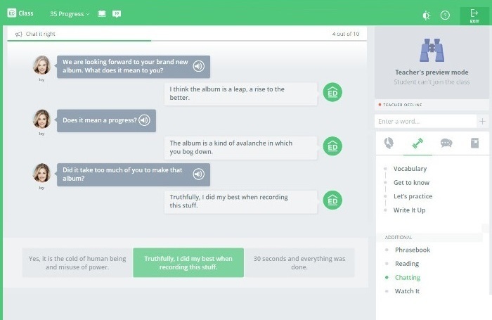 Если вы занимаетесь на нашей платформе ED Class, то увидете там упражнение Chatting — диалог с роботом на английском онлайн. Это задание является частью домашней работы и направлено на развитие навыка чтение и говорение.