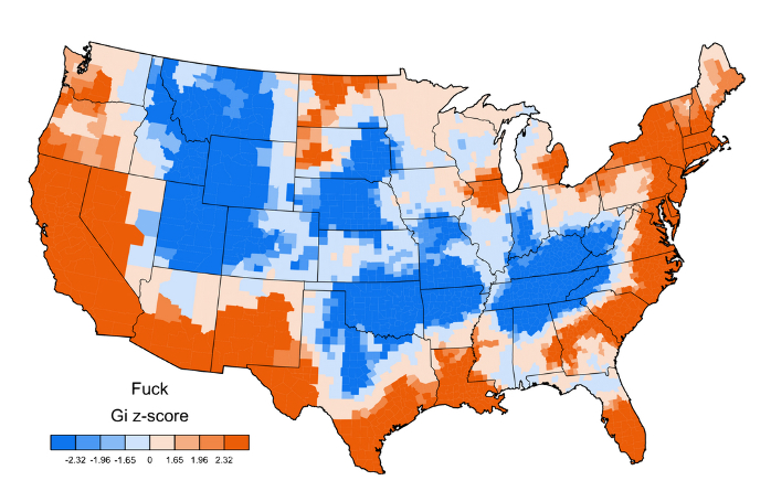 Now let's take a look at the "Fuck Map". Внизу в нас така карта популярності слова "fuck". Ось де слово "fuck" вимовляється найбільше у США. Як бачите, власне, багато де.