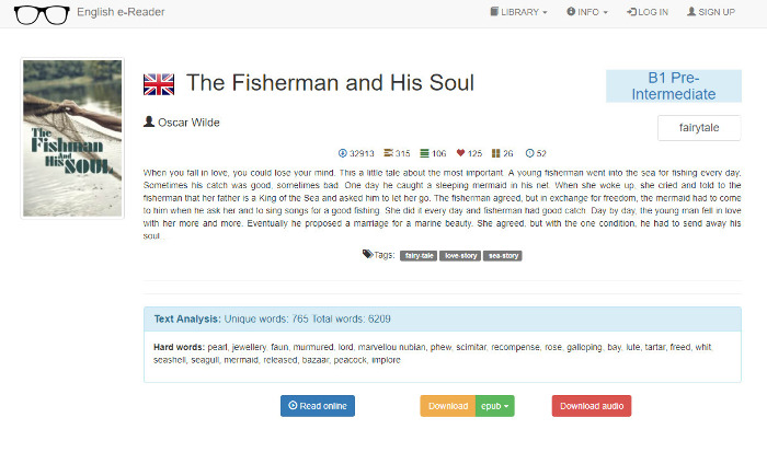 English E-Reader — онлайн-библиотека для изучающих английский. Отсюда книгу можно скачать, прочитать онлайн, либо прослушать в виде аудиокниги. Все они разбиты по уровням: от A1 до C2. И да, даже для Elementary тут есть что почитать. Например, история про Titanic содержит всего 650 уникальных слов. Сложные слова выписаны отдельно, и их можно выучить еще до начала чтения.