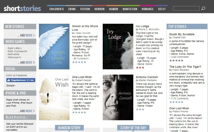 Short Stories — коллекция небольших художественных рассказов, сказок и так далее. Дословный перевод названия сайта (короткие истории) очень хорошо передает его смысл. Один такой рассказ можно прочитать за 15-30 минут. Иногда встречаются более короткие, но длиннее — крайне редко. Тексты разбиты по категориям: рассказы на английском языке для школьников, детективы, фантастика, ужасы, юмор, нон-фикшн, романы и научная фантастика.