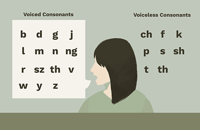 На этой картинке отмечены звуки, которые произносятся с голосом (слева) и без голоса (справа). Однако вы можете обратить внимание, что здесь всего 23 символа, а не 24. Дело в том, что на картинке изображены буквы и пары букв, а не звуки в том виде, в котором они передаются в транскрипции.