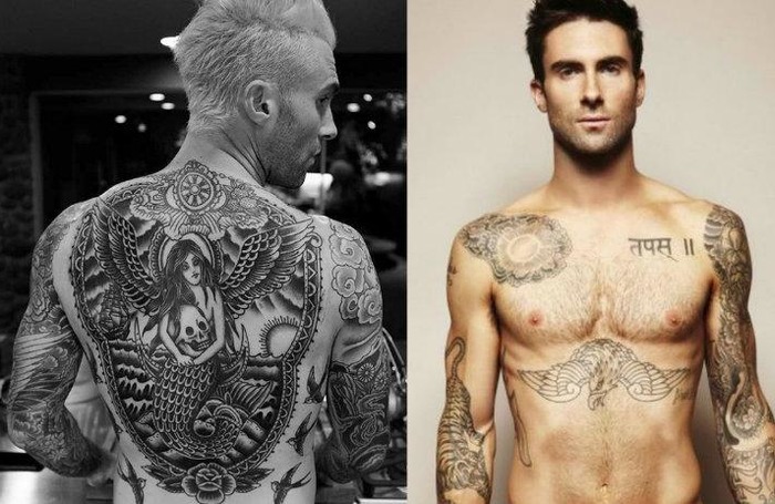 - Тело певца покрыто тату. Самая свежая — русалка во всю спину. На концертах Адам любит снять футболку и покрасоваться.