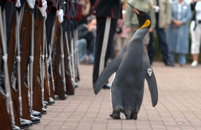 Ставши рыцарем в 2008 году, храбрый пингвин осматривает свои войска, когда Королевская гвардия прибывает на ежегодный Королевский эдинбургский парад военных оркестров.