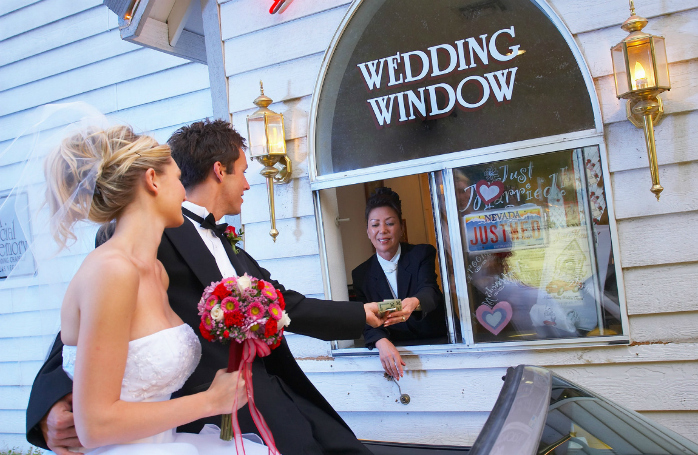 В Вегасе все, что вам нужно — это водительские права или паспорт + около $65 США для лицензии на брак, которую вам оформят всего за 20 минут. Принимаются только наличные. Вероятно, чек бы не успел к моменту произнесения клятвы верности.