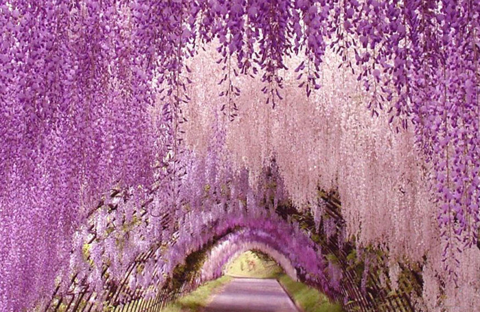 Тоннель Вистерия находится в японском саду цветов Кавати Фудзи, который расположен в городе Китакюшу, в 4 часах езды от Токио. Вистерия — научное название глицинии, данное ей двести лет назад. Со всех сторон вас окружают лианы этих невероятных цветов, источающих сладковатый аромат. Находясь в этом тоннеле, «it seems», кажется, что попадаешь в совершенно иной мир. Цвета тоннеля постоянно меняются, все зависит от освещения и времени года. Для того, чтобы увидеть сад во всем его великолепии следует приезжать к середине мая, когда глицинии цветут особенно пышно.