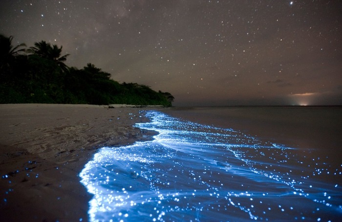 Хотели бы вы побывать на пляже, который ночью светится так, будто в воде плавают тысячи фонариков. Если да, то вам обязательно следует посетить остров Ваадху на Мальдивах. Именно здесь можно увидеть невероятное свечение, возникающее благодаря миллионам живых организмов. Объясняется оно биолюминесценцией — химическими процессами в организме планктона, которого волнами выбрасывает на берег. Благодаря этим процессам в организме этих живых организмов освобождается энергия, которая выделяется в форме света. В результате этого «phenomenon» — явления, создается впечатление, что вода отражает звезды на небе. В определенный период, а именно во время размножения планктона, такое сияние можно увидеть даже с космоса. Поверхность воды излучает яркий голубоватый свет.