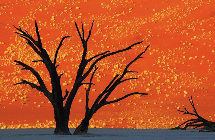 Изображение ниже — это не нарисованная картина, а самая настоящая фотография, сделанная в Национальном парке Намиб-Науклуфт в Намибии. Называется эта местность Дедвлей, что переводится как «мертвое болото» («dead» — с английского мертвый, и с бурского «vlei», озеро или болото в долине между дюнами). Раньше по территории этого плато протекала река, благодаря которой цвело множество деревьев акации. Однако однажды река изменила свой путь и оставила это место абсолютно без влаги, что превратило некогда цветущие деревья в засохшие скелеты. Высокие дюны, яркое чистое небо, палящее солнце и выжженные деревья превращают пейзаж в нечто совершенно «extraterrestrial», инопланетное.