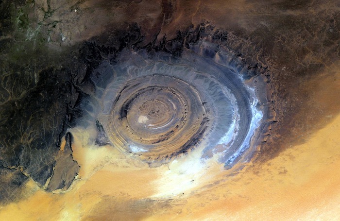 Еще одно удивительное и по-настоящему космическое место находится в Сахаре. Называется оно Структура Ришат или же Глаз Сахары. Это огромное геологическое образование имеет в диаметре 50 километров, поэтому отлично видно из космоса. Долгое время космонавты на орбите использовали его в качестве ориентира. Благодаря космонавтам эта структура и была обнаружена. Ученые изначально полагали, что Глаз Сахары является кратером метеорита, однако впоследствии эту теорию опровергли, так как дно Глаза совершенно плоское и совершенно не содержит результатов ударного действия. Сейчас «it is assumed that» принято считать, что такие кольца стали результатом эрозии, которая постепенно «срезала» горные породы. Возраст слоев горных пород составляет миллионы лет.