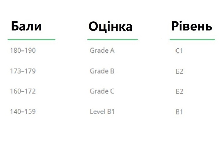 Отже, щоб отримати сертифікат Cambridge FCE, необхідно набрати не менше 160 балів. Максимальний показник становить 190 балів. Пропонуємо звернути увагу на таблицю нижче.