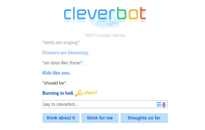 Утім, не такий вже бот і clever, якщо чесно. Напевно за кілька років з'являться більш тямущі роботи-співрозмовники, але поки поспілкуватися відверто з ботом складно. Повноцінного спілкування з людиною це не замінить, але зате можна залипнути і погратися півгодини-годину. Better than nothing.