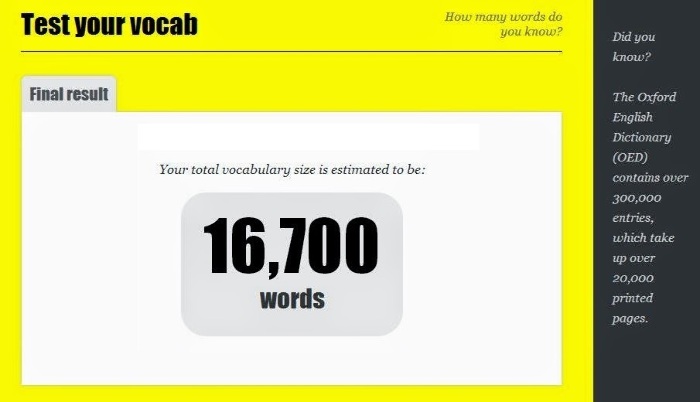 Також свого роду тест, але не нескінченний. На TestYourVocab вам дається список із кількох сотень слів. Щоразу обирати один варіант із чотирьох не потрібно - чесність на вашій совісті. Просто відмічаєте галочкою знайомі слова - і все. Сайт аналізує ваш словниковий запас і показує, скільки ви приблизно слів знаєте англійською. У середньому в російськомовних, які вивчають англійську, у пасивному запасі зберігається 2-5 тисяч англійських слів. Якщо у вас більше, значить ваш рівень англійської дійсно хороший.